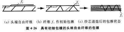 頭端自由纖維在第一噴嘴氣流旋轉的作用下,在紗芯上形成“Z”向纏繞(初始包纏),紗芯退捻時,頭端自由纖維進一步緊密包纏,如圖4—26所示。
