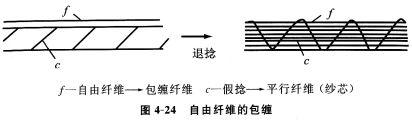 假設紗芯外表附有自由纖維f,在假捻紗芯作Z向退捻時,纖維f以退捻方向包纏在紗芯須條上,如圖4—24所示,包纏的情況與纖維性質(長度、剛度)和紗芯接觸狀況有關,尤其在紡紗氣圈高速轉動時,自由纖維短或接觸不良,形成包纏的難度大。