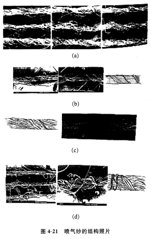 5)綜合兩種理論學說,噴氣紗的結構應為:紗芯纖維無捻基本平行,紗芯表面層的纖維有少量或一定數量的“Z”向捻回,外表再由包纏纖維包扎成噴氣包纏紗,如圖4—21(d)。