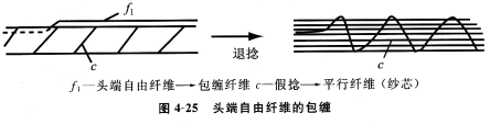 如圖4—25所示,自由纖維{的尾端被捻人紗芯,成為頭端自由的纖維,紗芯退捻時以退捻方向包纏在紗芯上(單噴嘴