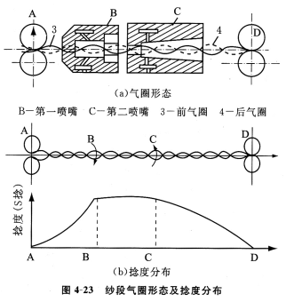 ③第二噴嘴的作用:對紗條積極加捻,使整段紗條上呈現同向捻回(假捻),在紗條退捻時獲得包纏真捻。