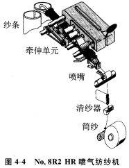 圖4—4表示兩個噴嘴加捻器并列。兩根棉條喂人同一個牽伸單元,由前羅拉輸出的須條分別進入各自的加捻噴嘴