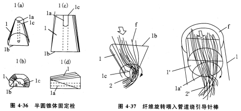 一端固定在錐體固定栓中心,另一端對準(zhǔn)空心錠5的頂端入口,纖維在輸送管道中旋轉(zhuǎn)運(yùn)動,繞在引導(dǎo)針棒上(見圖4—37),由于纖維與針棒的摩擦和阻礙,使捻度無法向前傳遞,在針棒處形成自由端。