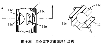 空心錠5的頂端成錐形,與固定壁有一間隙,即為旋轉(zhuǎn)氣流的排氣通道。空心錠內(nèi)孔是紗線通道5o,空心錠下部表面可加工成為風(fēng)葉狀11,如圖4—38所示。由下面進(jìn)氣孔8進(jìn)入壓力氣體,推動風(fēng)葉和空心錠回轉(zhuǎn),其回轉(zhuǎn)方向與渦流室氣流旋轉(zhuǎn)方向一致,主要作用是配合對紗條的加捻。氣流旋轉(zhuǎn)后從下面出氣孔9排出。空心錠由上下兩個(gè)空氣軸承7和10支承運(yùn)轉(zhuǎn)。