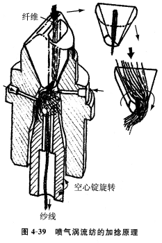 如圖4—38所示,4個噴射孔的噴射氣流與圓錐形內圓壁(渦流室)相切,形成旋轉氣流(渦流),在圓錐形渦流室內旋轉,氣流旋轉過程中沿著空心錠頂端錐形表面與固定壁間隙的錐形通道下滑,從排氣口排出。前羅拉輸出的須條,從輸送管道螺旋旋轉喂入,繞著引導針棒,如圖4—37和4—39所示,纖維頭端在引導針棒的引導下與空心錠中的引紗尾搭接,纖維另一端則被旋轉氣流吹散,順氣流旋轉倒下,形成一個傘形的狀態,在空心錠頂端旋轉,給須條加捻,紗由空心錠頂端內孔引出。纖維從前羅拉不斷喂人添加在傘形紗尾上,并隨氣流不斷地吹散旋轉而連續加捻成紗。