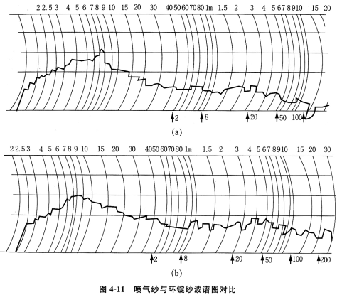 長期以來,國內外在環錠紡紗機上企圖實現超大牽伸(如1958年原上海第一棉紡織廠超大牽伸車間),但始終未能獲得成功,其主要問題是成紗的中長片斷不勻率惡化。然而,日本MJS噴氣紡紗機采用超大牽伸,其成紗均勻度遠優于環錠紡超大牽伸,未發現中長片段不勻率惡化現象,條干不勻率甚至優于普通環錠大牽伸(30~50倍)。從圖4—11[18]所示的紗線波譜圖可以看出:超大牽伸環錠紗的波譜圖(b)中在3-7m左右有較明顯的中長片段不勻,粗、細節多,強度低;而超大牽伸噴氣紗的波譜圖(a)中未見明顯的中長片段不勻。這就需要認真分折和認識噴氣紡紗高速超大牽伸的特殊工藝。
