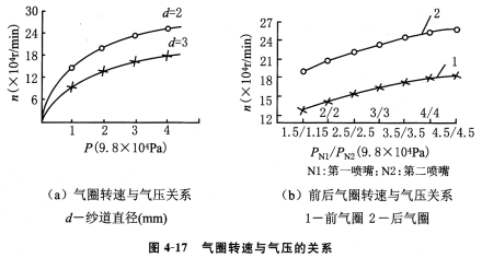 實驗證明氣圈轉(zhuǎn)速隨氣壓增加而加快,如圖4—17所示(測試條件:紡13.1tex、65/35T/C紗,紡紗速度140m/min,喂入比0.98)。