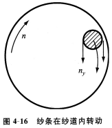 須條從吸口進(jìn)入紗道內(nèi),在高速旋轉(zhuǎn)的渦流場作用下,受氣流推動旋轉(zhuǎn)而加捻。由于紗條密度ρy遠(yuǎn)大于空氣密度,在離心力作用下,紗條向外側(cè)運(yùn)動,到達(dá)離心力(向外)與渦流場壓差(向內(nèi))的平衡位置(即靠近管壁)時,紗條旋轉(zhuǎn)方向與氣流旋轉(zhuǎn)方向相同(公轉(zhuǎn))而加捻,如圖4—16所示。