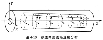 旋轉(zhuǎn)氣流的中心壓力低于外層壓力,形成負(fù)壓,加上旋轉(zhuǎn)氣流的軸向分速度作用,吸嘴具有一定吸力,使前羅拉輸出的纖維能順利吸人加捻器吸口中。紗道內(nèi)渦流場的速度分布由切向速度、軸向速度和徑向速度組成,如圖4—15所示。