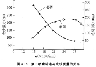 如上所述,第一噴嘴與第二噴嘴形成的氣圈不能相互干擾且要合理匹配。第一噴嘴的氣圈轉(zhuǎn)速會影響第一噴嘴與前羅拉鉗口之間的紗條張力及波動,決定頭端自由邊纖維的產(chǎn)生數(shù)量,即包纏纖維的多少。第二噴嘴的氣圈轉(zhuǎn)速決定加捻包纏效果,與成紗強(qiáng)度和紗線質(zhì)量有密切關(guān)系,如圖4—18所示。從圖中可見,成紗強(qiáng)度隨氣圈轉(zhuǎn)速增加而提高,達(dá)到某值后,強(qiáng)度反而有所下降。因此必須合理選擇和匹配兩者的關(guān)系,提高成紗質(zhì)量的同時,降低能耗和氣耗。