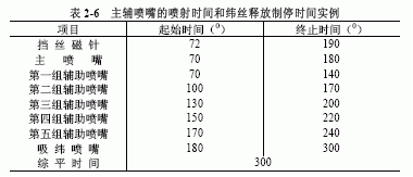 主輔噴嘴的噴射時間(電磁閥的開閉時間)和緯絲釋放制停時間(儲緯器上擋絲磁針的開閉時間)要嚴密配合。如圖2-20所示,電磁閥和儲緯器上擋絲磁針的開閉時間由電腦控制中心1輸入并自動監控。主輔噴嘴的噴射時間和緯絲釋放制停時間配合實例如圖2-21和表2-6所示。