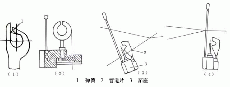 管道片結構與引緯過程如圖2-18所示。管道片有多種形狀與結構,如圖2-18(1)所示為脫絲槽封閉式管道片,引緯時,彈簧1將管道片的脫絲槽關閉,以防止射流擴散;如圖2-18(2)所示為脫絲槽開放式管道片,管道片上方敞開著一條脫絲槽。
