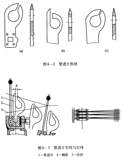 常見管道片的形式如圖6—2所示,引緯通道是由數百個管道片構成的,管道片之間要留有間隙,以容納經紗。引緯時,管道片要插到上、下層經紗之間。引緯后,隨著鋼筘的向前擺動,管道片逐漸退出下層經紗,引入管道的緯紗從管道片上方的脫紗槽脫出,被鋼筘推向織口,如圖6—3所示。