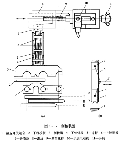 (3)當(dāng)片梭被制停在位置Ⅲ,接近開關(guān)c不發(fā)出信號,說明制梭力偏大,計算機(jī)自動記錄制梭力偏大的次數(shù),如果27次引緯中有20次制梭力偏大,則每27次引緯后步進(jìn)電動機(jī)反向轉(zhuǎn)動一步,使制梭腳上升一定距離,經(jīng)幾次調(diào)整直至片梭被制停到位置Ⅱ,然后,再自動調(diào)整到位置I。這樣的調(diào)整方式有助于消除機(jī)構(gòu)間隙對制梭的影響。