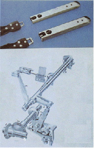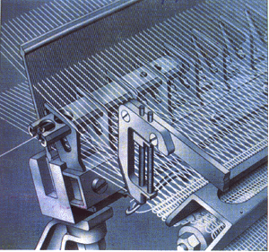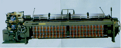 用片狀?yuàn)A緯器(或稱片梭)將緯紗引入梭口的織機(jī)。片梭織機(jī)的引緯速度高,對(duì)織物品種的適應(yīng)性強(qiáng),可織制闊幅織物,機(jī)器噪聲較低。片梭織機(jī)有PU和PS兩種系列,工作寬度為220~545厘米,分單色和多色兩種,可織制棉、毛、化學(xué)纖維等純紡和混紡織物。如加裝多臂和提花開口機(jī)構(gòu),可織制小花紋和大花紋織物。1933年德國(guó)人R.羅斯曼首先提出片梭引緯;1934年瑞士蘇爾澤公司研制出片梭織機(jī),50年代初投入商業(yè)生產(chǎn)。片梭織機(jī)與一般有梭織機(jī)的不同處在引緯、打緯與織邊三個(gè)部分。引緯由盛梭箱、扭軸投梭機(jī)構(gòu)、導(dǎo)梭軌、接梭箱和片梭傳送機(jī)構(gòu)等部分組成。每臺(tái)織機(jī)設(shè)有片梭若干只,順序從織機(jī)的供緯側(cè)將緯紗引入梭口。投梭的動(dòng)力來(lái)自扭軸加扭時(shí)貯存的彈性位能,剩余能量由油壓緩沖器吸收。片梭沿導(dǎo)梭軌運(yùn)動(dòng)。它進(jìn)入接梭箱被制動(dòng)后,由梭口下方的傳送機(jī)構(gòu)送回原處。打緯采用共軛凸輪機(jī)構(gòu)。當(dāng)筘座前進(jìn)時(shí),導(dǎo)梭軌退出梭口移到布面下方,完成打緯動(dòng)作;筘座后退靜止時(shí),導(dǎo)梭軌插入梭口,片梭沿導(dǎo)梭軌前進(jìn),將緯紗引入梭口。在片梭織機(jī)上應(yīng)用折入、絞經(jīng)和中間織邊裝置,織制單幅、雙幅或多幅織物??椫坪铣衫w維織物時(shí)用熔邊裝置使邊部經(jīng)紗固定。70年代以來(lái),片梭織機(jī)廣泛采用儲(chǔ)緯器,電子檢測(cè)織機(jī)停臺(tái)等裝置以提高織機(jī)生產(chǎn)率;同時(shí)還試驗(yàn)成功用機(jī)械、氣壓或直線感應(yīng)電動(dòng)機(jī)等方法投射一端或兩端緯的單只片梭、往復(fù)引緯的片梭織機(jī)。