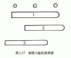 如圖2-35所示,制梭力由制梭腳的高低位置控制,即制梭通道間隙越小,制梭力越大。在片梭引緯中實現自動調整制梭力,在制梭腳前側安裝有接近開關a、b、c,如圖2-37制梭力監控原理圖所示,接近開關b用于檢測片梭飛行到達時間,如果在規定時間未能觸發接近開關b,則片梭投梭力不足,進入制梭裝置的時間太遲。接近開關a、c用于監測片梭的制停位置。在規定的時間,當片梭制停在位置1時,接近開關a、c均產生信號,說明制梭力正常,制梭馬達6不發生作用;當片梭制停在位置2時,接近開關a沒有產生信號,說明制梭力不足,制梭馬達6立即發生作用,使制梭腳1下降一級;當片梭制停在位置3時,接近開關c沒有產生信號,說明制梭力太大,如果連續27次引緯中有20次制梭力偏大,制梭馬達6發生作用,使制梭腳1抬高一級,反復幾次調整直至片梭制停在位置1上。