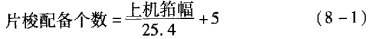 片梭飛到對側(cè)的接梭箱后,由位于經(jīng)紗下方的輸送鏈將片梭從接梭箱側(cè)運(yùn)回到投梭箱的升梭器內(nèi)。輸送鏈的鏈條節(jié)距是12.7mm(0.5英寸),每隔20節(jié)鏈條,裝有一個(gè)推梭塊,片梭在推梭塊推動(dòng)下返回投梭側(cè),相鄰兩個(gè)推梭塊的間距為25.4cm,兩個(gè)推梭塊間有一個(gè)片梭。因此,每臺織機(jī)所需的片梭個(gè)數(shù)與上機(jī)筘幅的大小有關(guān),可按式(8—1)計(jì)算: