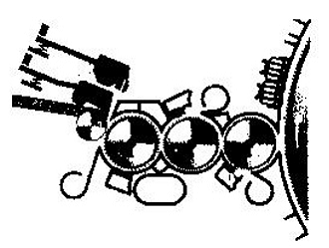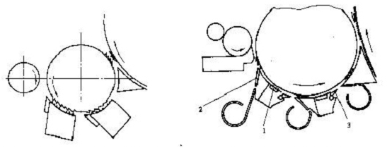 (三)多刺輥梳理機構 為了增加刺輥部分的分梳效果,除增設分梳板外,一些梳棉機上采用了多刺輥梳理機構,如圖3-2-13所示。它包括三只分梳除雜刺輥,每個刺輥都配有一塊分梳板和一只帶吸風管的除塵刀組合件,這三只刺輥包覆有三種不同規格的針布,齒密依次增加。三只刺輥的直徑較小,各刺輥表面線速度依次增大,并與錫林速度相匹配