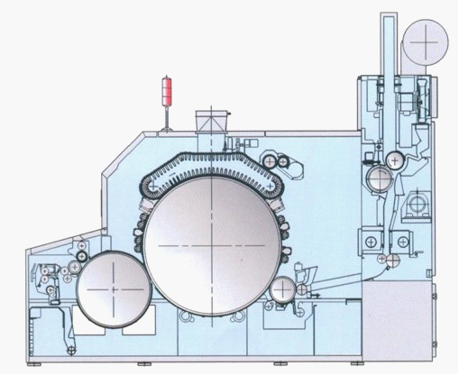 刺輥是預梳部分的主要部件,為中空滾筒,表面包嵌鋸齒條,轉速較高。刺輥下方的除塵刀和帶有網眼或塵棒的弧形漏底,用以托持纖維并排除雜質和短絨。錫林和道夫均為中空滾筒,表面包覆針布。錫林的直徑較大,是全機的主體。蓋板和錫林是主梳部分的主要部件,蓋板總根數一般為106~110根,和錫林相互作用的工作蓋板為41~43根。蓋板外形狹長,截面呈T字形。蓋板工作面包覆針布,其兩端與支承曲軌的接觸面做成踵趾弧面,弧面前后高低相差0.5~0.9毫米。同錫林相互作用的各蓋板的進口隔距大,出口隔距小,使分梳作用逐漸增強。所有蓋板通過鏈條連結傳動,緩慢地自后向前回轉循環,輪流起分梳作用。越出工作區的蓋板針面上抓取的短絨、雜屑和部分可紡纖維,由蓋板斬刀剝下,成為蓋板落棉。清潔后的蓋板返回機后,重新進入工作區,因此稱回轉式蓋板梳理機。錫林下方的大漏底由兩塊三角形塵格和弧形光板組