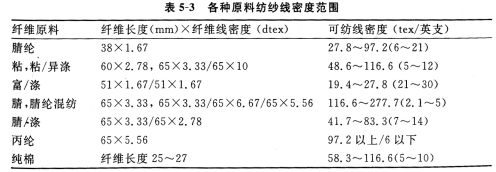 渦流紡紗可紡的紗線線密度范圍為19.4—277.7tex(2.1s-30s)。較細(xì)、偏長的纖維可紡細(xì)線密度紗,粗、短纖維的紡紗線密度偏大。各種原料的可紡線密度范圍見表5—3所示。