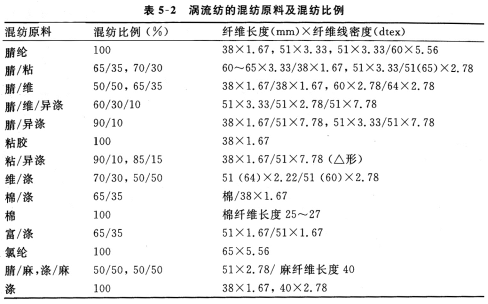 適紡的纖維長度和線密度分別為25—65mm、0.17—0.78tex,即從棉型系列到中長系列均可紡。但不適于紡純棉,主要是由于棉纖維的長度差異大、成熟度不一致、纖維表面狀況不均勻、雜質(zhì)較多等緣故。但可采用混紡,比例應(yīng)控制在30%以下。表5—2列舉了渦流紡可紡的不同纖維原料所采用的混紡比。