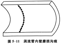 纖維環在渦流管內由離心力的作用貼向管壁,與其產生摩擦。每分鐘高達近10多萬轉的回轉摩擦,會使渦流管壁磨出痕跡,呈現出約2mm的波浪魚尾狀的溝痕,如圖5—11所示。導致成紗出現粗細節、起毛、條干惡化、強度降低,使之不能正常有效紡紗。因此要求管內壁表面光潔,選用摩擦系數小且堅硬的材料。試驗證明,采用有機玻璃、銅、45號鋼、九五玻璃、45號鋼滲碳處理、鉻12滲硼處理、45號鋼鍍鉻等,壽命都不會超過400~1000h,二氧化鋁也只有1500h。