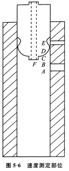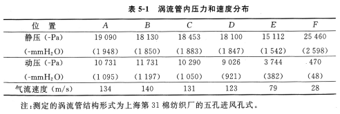 圖5—6為渦流管內(nèi)微型畢托管測定的部位。A、B、C、D、E、F六點(diǎn)均在紡紗位置附近并接近管壁處。測得數(shù)據(jù)及計算結(jié)果列于表5—1中。