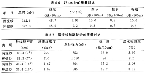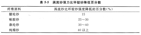 渦流紗的結構特點,決定了其成紗強度低于環錠紗。不同纖維原料所紡的渦流紗,其強度也不同。表5—5表示它與同等環錠紗的對比數據。