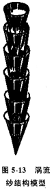 新纖維搭接在紗尾環上是連續進行的。纖維按先后次序卷在自由端上而成紗。如果將渦流紗用手緩慢拉斷,紗體先繞中心軸向旋轉;繼續增加張力,會產生一段滑脫現象,最后斷裂,斷裂的纖維多數在紗芯部位。所以渦流紗的結構模型和鉛筆卷刀削下的鉛筆木片結構相似,如圖5-13所示。