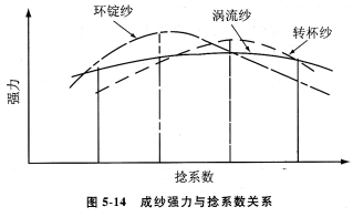 轉杯紗的捻度一般比環錠紗高10%,渦流紗的捻度比環錠紗低。對環錠紗和轉杯紗而言,在臨界捻系數以下,成紗強力隨捻度增加而增加;超過臨界捻系數后,紗的強力隨捻度增加而下降。曲線斜率大,說明捻度與成紗強力關系密切。而渦流紗的捻系數在較大范圍內變化時,其成紗強力變化不大,紗的捻系數與強力的關系不密切,曲線斜率平坦。