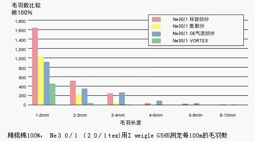 噴氣渦流紡設備加工棉纖維時,對棉纖維特性有較高的要求,需要高等級的棉花,纖維長度要長,短纖維含量要少。棉纖維長度較短,短絨含量高時將導致紡紗生產中纖維散失明顯,織物耐磨性差。