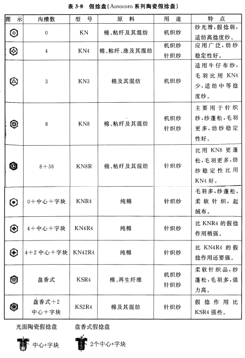 在紡紗線(xiàn)密度和工藝條件一定時(shí),摩擦力矩主要與假捻盤(pán)的表面摩擦系數(shù)、紡紗張力及紗條在假捻盤(pán)上的包圍角相關(guān),即決定于假捻盤(pán)的結(jié)構(gòu)參數(shù)和表面性狀。因此,假捻盤(pán)的直徑、表面曲率半徑、表面性狀是關(guān)鍵的技術(shù)參數(shù)。假捻盤(pán)現(xiàn)已系列化,可適應(yīng)不同纖維原料和線(xiàn)密度的紡制。表3—8列舉了系列假捻盤(pán)的主要技術(shù)參數(shù)和適紡原料及其應(yīng)用和特點(diǎn)。