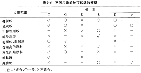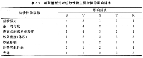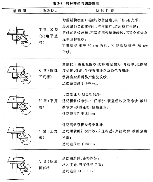 現代轉杯紡紗機可配置不同形式的凝聚槽,以適應不同纖維和不同紡紗要求。表3—5和表3—6所示為不同形式凝聚槽的紡紗性能及適紡品種(以賜來福公司為例),表3—7給出了不同形式的凝聚槽對主要紡紗性能指標的影響排序。
