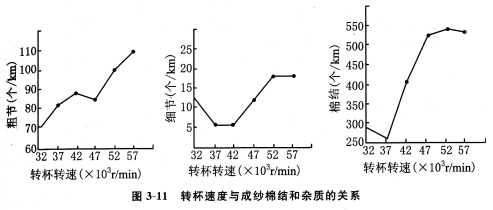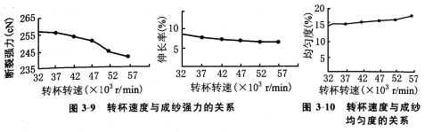 圖3—9、3—10、3—11、3—12的實驗結果表明轉杯速度增加對成紗強力、條干均勻度、棉結雜質、紗線毛羽的影響(試驗條件:棉纖維27mm×0.17tex,紡紗線密度27.8tex,捻度91.38捻/10cm,轉杯直徑49mm,假捻盤直徑16mm)。