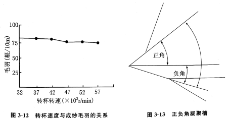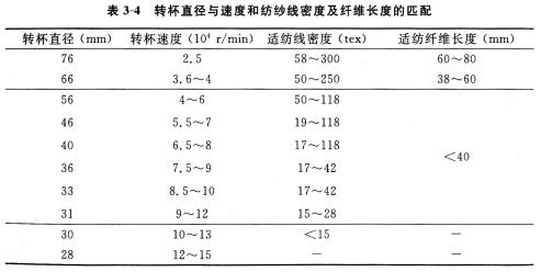 轉杯速度與直徑密切相關。轉杯速度不僅反映了該紡紗技術高速高產的水平,同時意味著紡紗張力大增,這對成紗質量有顯著影響。表3—4所示為轉杯直徑與轉杯速度和紡紗線密度及纖維長度的匹配關系。