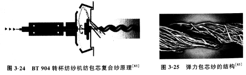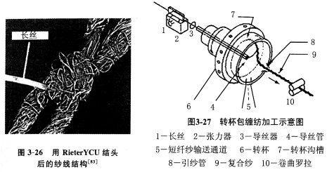 化纖長絲由導(dǎo)絲管從轉(zhuǎn)杯底部軸中心的空心孔進(jìn)入杯內(nèi),與原杯內(nèi)的短纖維紗條結(jié)合加捻,形成短纖維紗條包纏于長絲周圍的包芯紗,如圖3—25所示。這種紗線具有條干均勻、毛羽少、強(qiáng)度高的優(yōu)點(diǎn)。