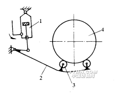 如圖2-20所示,交流電動機(jī)AD通過傳動帶傳動滾筒1恒速傳動,整經(jīng)軸2擱在導(dǎo)軌上,