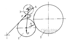 N,壓輥裝在壓輥臂3上,繞O點轉(zhuǎn)動,壓輥臂的另一端A上裝有拉力彈簧,彈簧拉力F對O的力矩用以平衡壓輥對O的重力矩,在壓輥臂上還施加著由壓輥加壓油缸和制動器所產(chǎn)生的恒定力矩M。以壓輥臂為脫離體,見圖2-24所示,根據(jù)對O點的力矩平衡方程可得