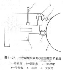 由于圓臺體錐度α已知,上機(jī)時只要工藝設(shè)計的紗層厚度值b與實際情況一致,那末由式2-4確定的h值能保證條帶成形良好。為了保證紗層厚度值設(shè)定正確,一些新型分條整經(jīng)機(jī)上在定幅筘底座有紗層厚度自動測量裝置,如圖2-27所示,在底座5上裝有定幅筘1、測長輥2、