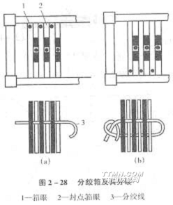 為使織軸上的經(jīng)紗排列有條不紊,保持穿經(jīng)工作順利進(jìn)行,要進(jìn)行分絞工作。分絞工作借助于分絞筘完成,分絞原理如圖2-28所示。條帶的紗線依次引過筘眼1和封點筘眼2,筘