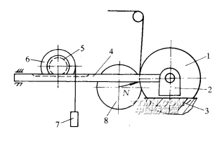 通過導(dǎo)輥2、3后,由帶液輥4給經(jīng)紗單面上乳化液,然后經(jīng)導(dǎo)輥5卷繞到織軸6上。帶液輥以一定速度在液槽7中轉(zhuǎn)動,液槽的液面高度和溫度應(yīng)當(dāng)恒定,調(diào)節(jié)帶液輥轉(zhuǎn)速可以控制上液量,一般上液量為經(jīng)紗重量2%~6%。