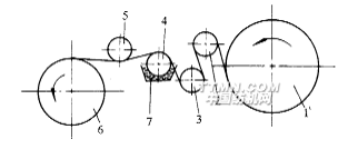 1-滾筒2、3、5-導(dǎo)輥4-帶液輥6-織軸7-液槽