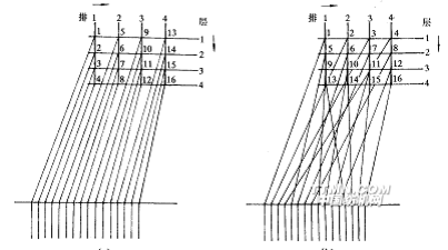 不方便,但因引出距離較短的前排紗線穿入紗路包圍角較大的伸縮筘中部,而后排穿入包圍角較小的邊部,能起到均勻紗線張力的作用,并且紗線斷頭時也不易纏繞鄰紗。分層穿筘法則從上層(或下層)開始,把紗線穿入伸縮筘中部,然后逐層向伸縮筘外側穿入,如圖2-18(b)所示。此法紗線層次清楚,找頭、引紗十分方便,但擴大了紗線張力差異,影響整經質量。因此,目前整經機上多采用分排穿筘法。
