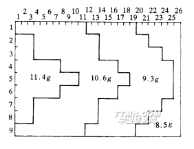 1452型整經筒子架上弧形四分段的張力圈重量配置圖。張力圈重量為11.4、10.6、9.3、8.5g弧形四段配置比全部為16.5g,全幅張力不勻率顯著降低。