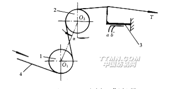 1、2-導輥3-傳感器4-紗線a、b-應變片式傳感器引線