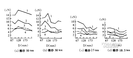 當導紗距離不同時,紗線退繞平均張力也發生變化。實踐表明,存在著最小張力的導紗距離。大于或小于此值,都會使平均張力增加,這是因為導紗距離越長則退解氣圈的紗線質量越大,退解時氣圈離心慣性力也越大。導紗距離小時,則紗線在退解時易與筒子摩擦,又使張力有所增加。生產中一般采用的導紗距離為140~250mm,對于滌棉紗,為了減少紗條扭結,以采用偏短的導紗距離為宜。