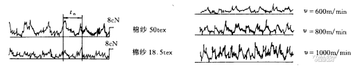 圖2-13所示為導紗孔處紗線的張力變化曲線。圖2-13(a)組曲線反映了相同整經速度
