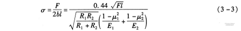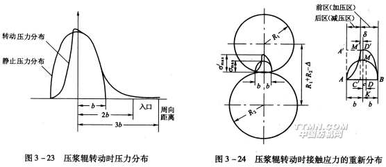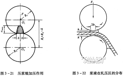 如圖3—24所示,壓漿輥靜止時,壓強(接觸應力)總和可用以C點為中心的半橢圓面積AAMB表示,其半軸為b和σmax,σmax為最大壓強,總面積等于壓漿力: