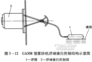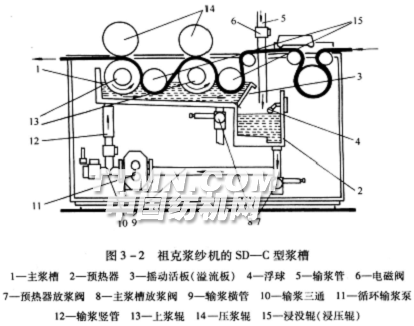 從圖3—2看,由調漿桶送出的漿液經輸漿管5和電磁閥6流入預熱器,再從預熱器下部經輸漿橫管9由循環輸漿泵11抽吸,從輸漿豎管12進入主漿槽1的前部。當漿液盛滿時,即經后方溢流板上沿呈瀑布狀流回到預熱器2,完成漿液循環。主漿槽平底從前到后向下傾斜約35mm,也有助于漿液流瀉和清潔。由于紗片經過漿槽上漿會帶走一部分漿液,所以回流到預熱器的漿液必定少于預熱器送出的漿液量。這時安裝在預熱器中的浮球就會隨著液面下降。浮球杠桿的支軸轉動通過預熱器外的電器盒,操縱限位開
