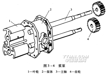 保持漿液循環的主要裝置是循環輸漿泵。祖克漿紗機配置的高效漿泵如圖3—4所示,由一對特殊形狀的葉輪組成,兩片相位錯開90°排列,用一對正齒輪傳動。動力來自于專用電動機,1.1kw,轉速1300r/min,配有減速器,使漿泵主軸速度能達到193r/min。循環漿泵能夠確保輸漿量較耗漿量高出30%以上。